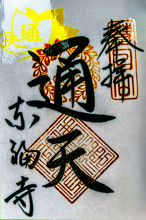 デザイン的な構図は、冒頭の通年頒布の「通天」の御朱印をベースとし、左上に黄色の「通天もみじ印」が押印された、ヤバぃよ素敵な御朱印。…だから どんな朱印や