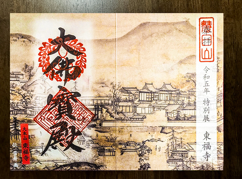 御朱印に描かれるのは、室町時代の水墨画家(禅僧)の雪舟が描いたとされる室町時代の東福寺伽藍。東福寺最古の遺品とされる。