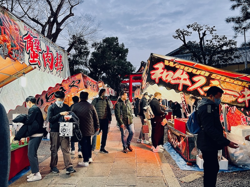 三が日は参拝客が増え始める午前10時頃を見計らってオープンする屋台が増え始め、以降は終日営業。