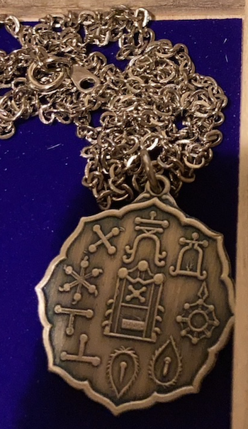 中には文字のような模様がレリーフで表現された金属製のペンダントが、パンツちら見え級にチラ見えちまってる。