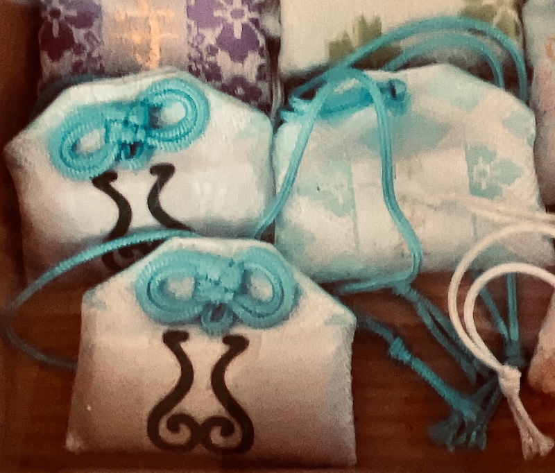 ピンクとブルーの何らかの花が、刺繍で思わず死臭がただよっちまぅほど素敵にキュート♡にあしらわれたお守り💋