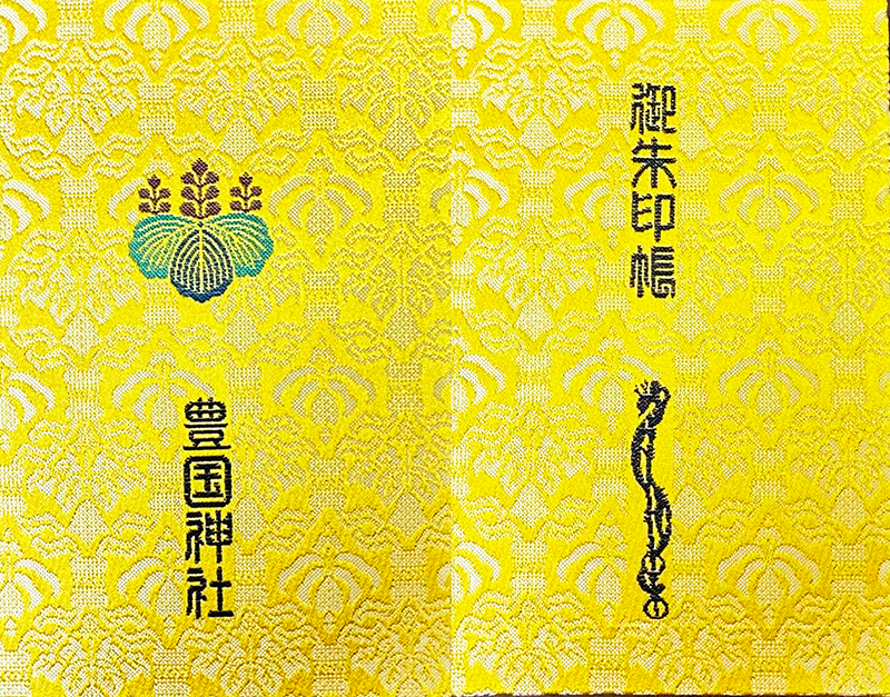 京都 豊国神社に伝存される宝物の一つ、秀吉の羽織「黄紗綾地菊桐紋付胴服(重要文化財)」の柄をそのまま表紙として転用したなんとも雅やかな朱印帳。